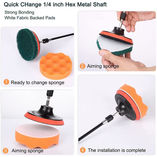 【Changez rapidement l'arbre】 L'arbre de fixation de la perceuse à brosse is an arbre à dégagement rapide in standard industrial steel of 1/4 pouce, firmly connected to the embout of brosse, et la tige de longue durée is suffisamment solid to resist to an intensified frottement.